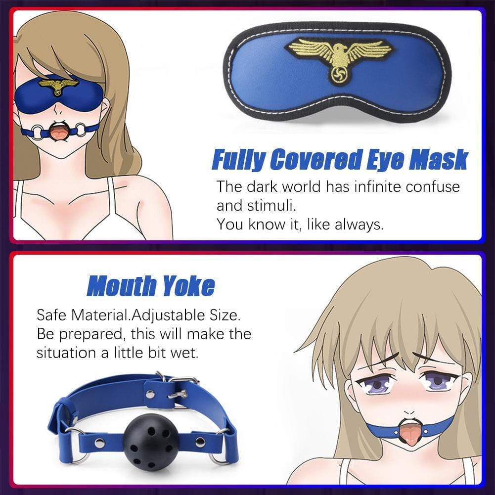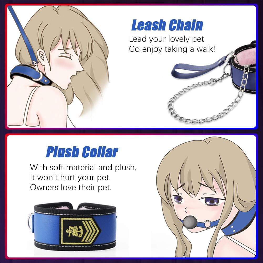 This bondage kit has 11 PCs included: 1 pair of ankle cuffs, 1 eye blindfold,1 whip, 1 leash chain, 1 collar, 1 pair of nipple clip, 1 mouth yoke, 1 cross strap, 1 bondage rope, 1 tickle feather. Each one is made of high-quality material, which is 100% body-safe.